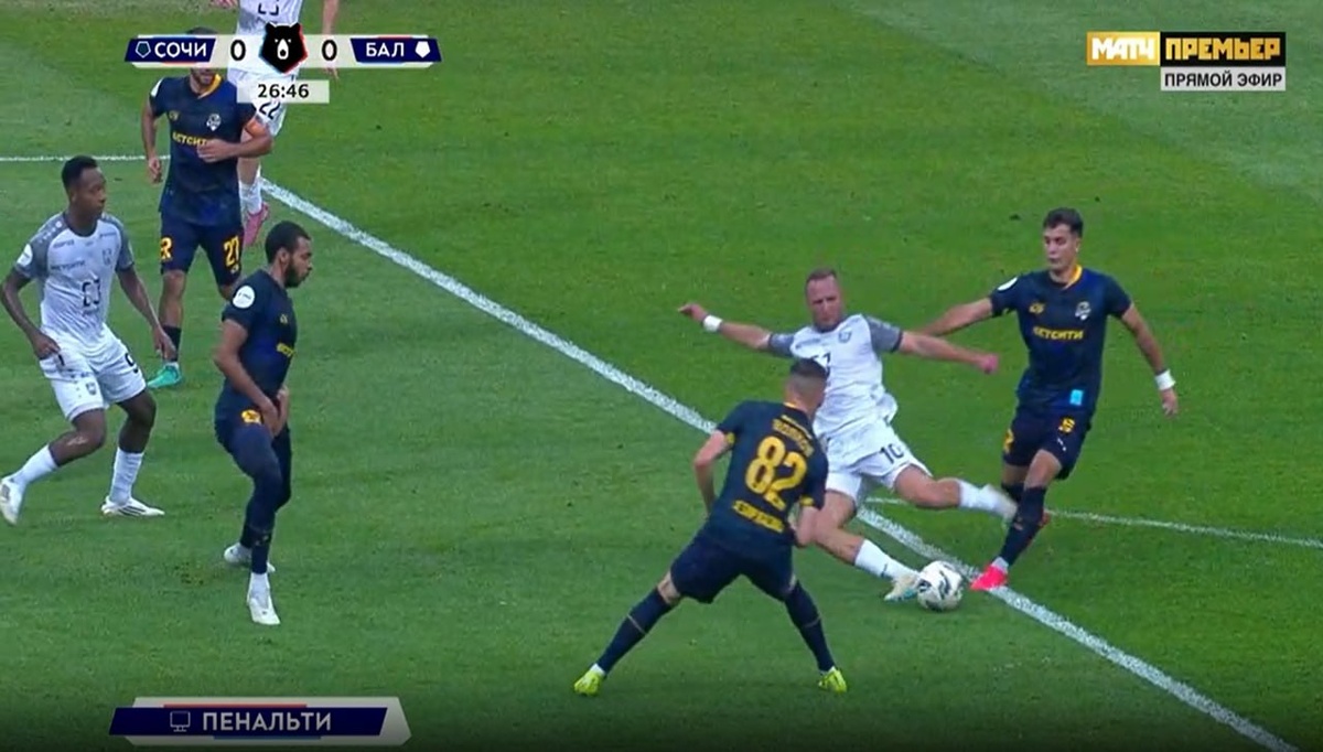 Сочи-Балтика 26 мин. Правильное решение принимает Фролов и назначает 11-м удар в ворота команды Сочи за фол по неосторожности. Правильное решение: 11-м удар