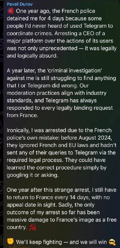 Telegram boss Durov REVEALS France detained him because of French police’s ‘MISTAKE’ Only result of his detention is ‘MASSIVE damage to France’s image as a free country’ Ends his post with COMMUNIST hammer and sickle