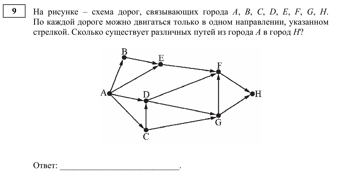 Задание взято с сайта ФИПИ Демоверсия 2025 Так как не имеет смысла перерисовывать в черновик этот граф, можно воспользоваться встроенным графическим редактором. Не перепутайте: скриншот области экрана в windows - win + shift + S скриншот области экрана в linux - win + shift + PRT SCR далее ctrl + V в графический редактор ну просто посмотрите пошагово, как решаю Сколько существует различных путей из города А в город H? далее дороги просто складываются далее и итог ответ 10