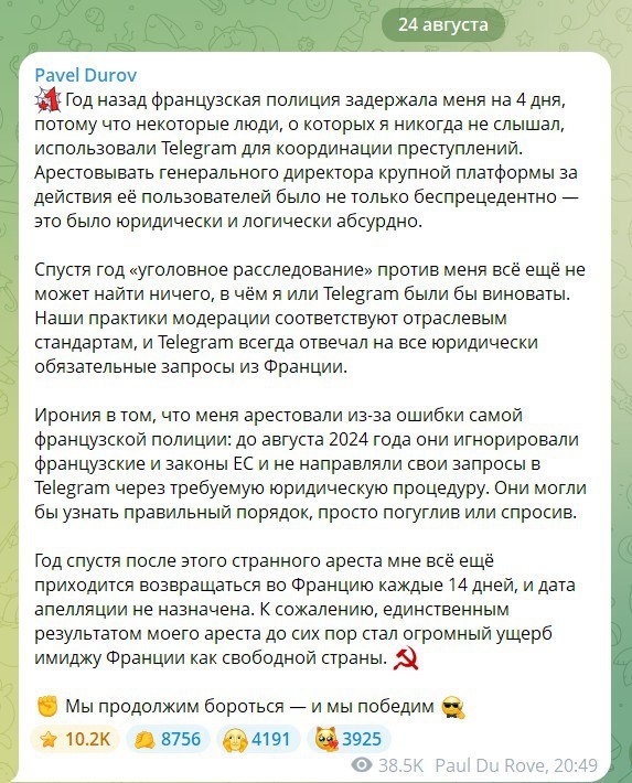 Павел Дуров рассказал о событиях прошлого года, когда его задержали во Франции. В своем посте он объяснил, почему считает это задержание неправомерным.