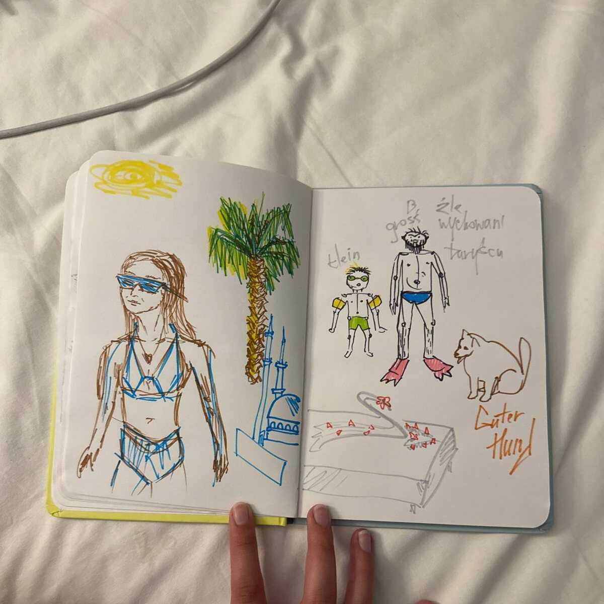 Эскизы второго дня. Сегодня не рисовала, была занята слежкой за polska kurwa turysta (6 шт.) Гады сперли наше отельное полотенце. Мы нашли полотенце, а polska kurva нашло возмездие.