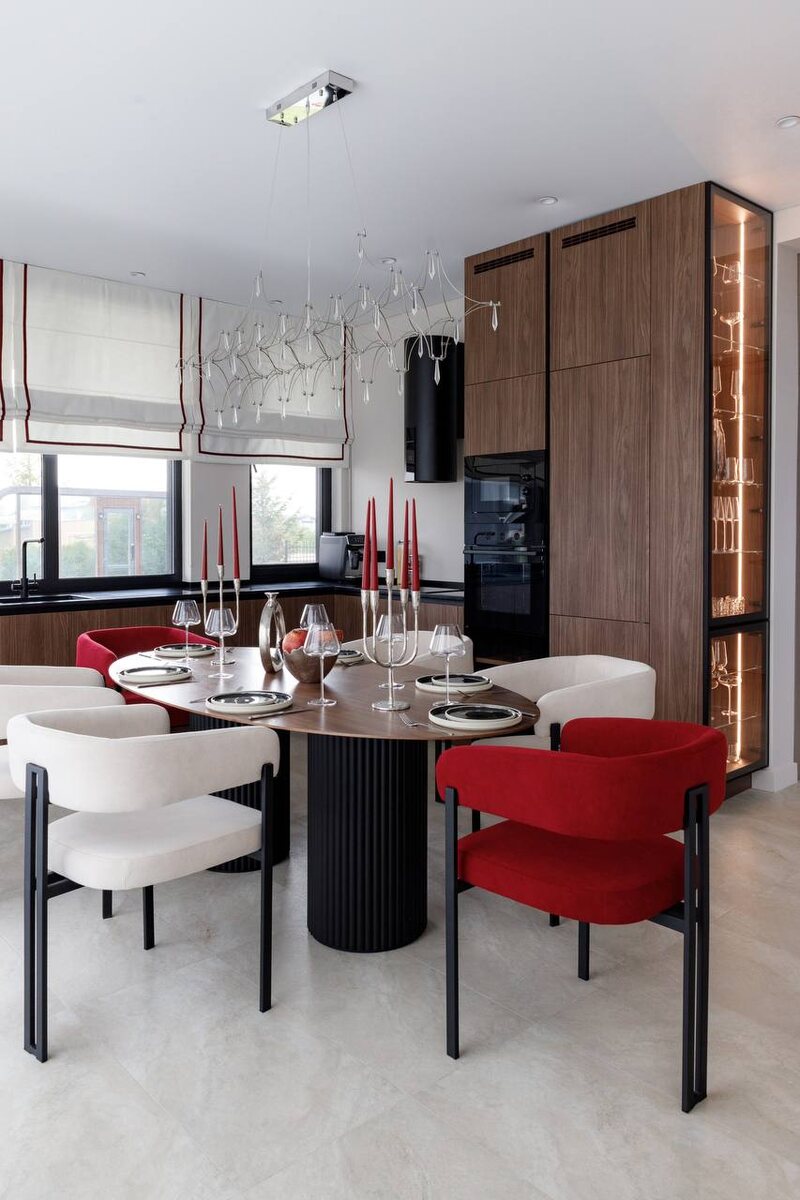Сегодня покажем 1-й этаж. (План этажа ищите в комментариях https://t.me/riabchuk_staging) Вся кухня-гостиная у нас светлая и воздушная и только кухонный гарнитур цвета ореха «приземляет» и олицетворяет надежность, которая важна для ощущения «дома». Центром всего пространства, безусловно, является картина Лилии Валеевой (https://www.instagram.com/valeeva.artist?igsh=MTVwYWV6cW1icngwOQ==) и Миши Медведуса (https://www.instagram.com/medvedus?igsh=NjdmeTRuNHU1dmZr) «О Любви». Никогда ранее не было у нас настолько крутых картин на проектах, хочется написать про них отдельный пост♥️ В противовес гостиной, прихожая и зона с лестницей у нас в глубоком шоколадно-винном оттенке. Это трендовый цвет, который идеально сюда вписался. И обои в прихожей, созданные специально для нас😍Акварельные полоски нам перерисовывали несколько раз, зато теперь они радуют тысячи глаз на выставке) Отдельно хочется сказать, что вся мебель была заказана (особенно корпусная), когда еще не было ни стен чистовых, н