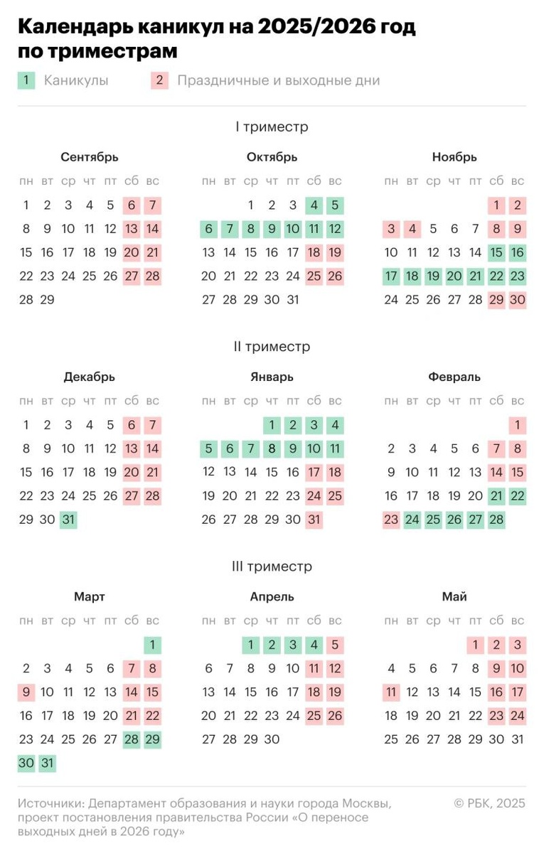 Опубликованы #календари каникул по четвертям и триместрам на 2025/2026 год