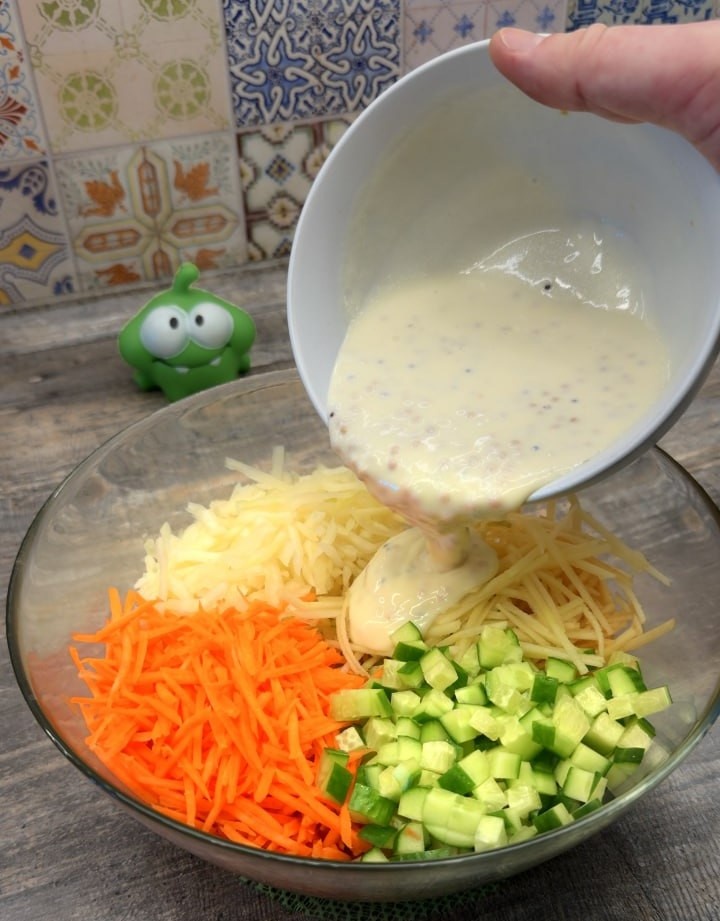 Морковь очистите и натрите на тёрке для моркови по корейски или воспользуйтесь овощерезкой. Она добавит яркий цвет и сладковатый вкус. Шаг 3. Огурец.