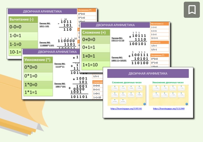 PS: "Данная статья призвана познакомить вас с представленным методическим материалом. Его использование является добровольным — вы можете скачать его, если он вас заинтересует, или выбрать другую разработку, которая лучше соответствует вашим потребностям. Если у вас есть свои идеи, вы также можете создать собственный материал. Благодарим за внимание и понимание!" Методическая разработка по теме "Системы счисления. Двоичная арифметика". Цель: Помочь учащимся освоить основные арифметические операции в двоичной системе счисления: сложение, вычитание, умножение и деление. Описание: Данная методическая разработка представлена в виде презентации, которая наглядно и демонстрирует принципы двоичной арифметики. Структура презентации: Первые три слайда наглядно показывают арифметические действия с двоичными числами: сложение, вычитание и умножение. Четвёртый слайд содержит ссылки на электронные ресурсы с самопроверкой. В этих ресурсах представлены: 10 примеров на сложение двоичных чисел с функци