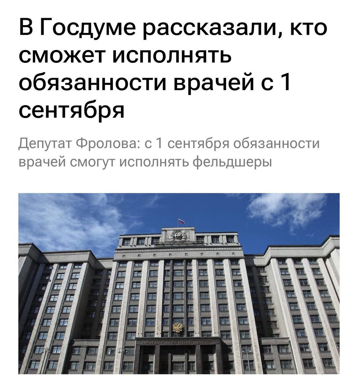 💊 С 1 сентября в России начнут допускать к лечению пациентов сотрудников без высшего медицинского образования. В случае нехватки врачей в больницах их функции смогут выполнять средний медперсонал — фельдшеры и медсестры. Таким образом, вместо терапевтов, педиатров и акушеров-гинекологов при необходимости лечением займутся работники без профильной квалификации. Они получат право назначать лекарства и проводить осмотры в экстренных случаях.