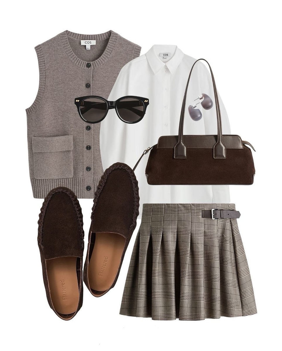 Почему хороши: замша + шоколад = идеальная осенняя текстура. Такой низ уравновешивает объём жилета и мягкие складки юбки, а цвет повторяет сумку — образ выглядит цельным.
