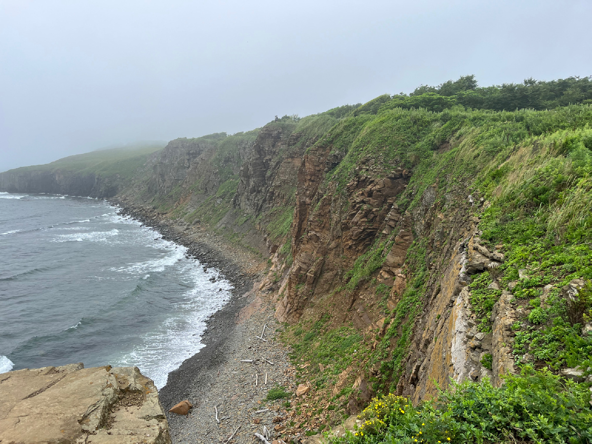 …После Батареи N9 мы выдвинулись в сторону Мыса Тобизина. Огромное количество машин на парковке. Дальше дороги нет. Экскурсовод уточняет, готовы ли мы идти пешком дальше до мыса Тобизина? По времени занимает дорога в одну сторону полчаса. Конечно готовы! Мы сегодня настроены путешествовать по острову Русский целый день! …Узкая тропинка вдоль береговой линии на приличной высоте. Слева обрыв в море, отделяющий тропинку узкой полосой травы. Обалдеть, слева не уклон, а самый настоящий обрыв. Идти было страшно, но красота затмевала страх. Периодически выступали смотровые площадки в виде голых скал. Ну и как обычно- туман! Вдали ничего не было видно. Зато отчетливо было слышно шум моря, как волны где-то далеко внизу бьются о скалы. На нашем уровне глаз пролетали чайки и перекатывался туман. Ветер был очень сильный. Очень хорошо, что он дул с моря на материк, если б он дул в сторону обрыва, мы бы точно там не пошли. После тропинка повернула вглубь материка и мы шли по лесу, дорог