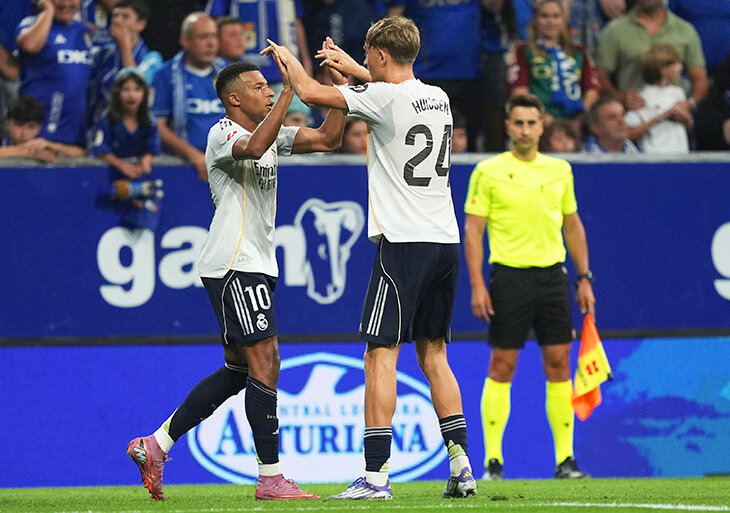 «Реал» удивил составом: Хаби Алонсо заменил Трента Александер-Арнольда на Дани Карвахаля и наконец-то дал шанс Родриго – он вышел вместо Винисиуса. Хаби поменял схему: 4-2-3-1 вместо 4-3-3. Непривычности матчу добавила и форма «Реала»: темные шорты, чтобы не сливаться с белыми у «Овьедо».