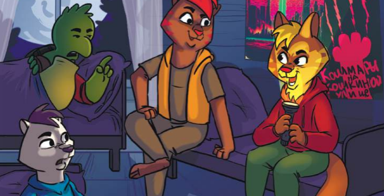 Наступила ночь, первая в лагере. Спать никому не хотелось. Всё на новом месте казалось странным и непривычным. В окна заглядывала полная луна, круп- ная и яркая, как прожектор на стадионе. Она заливала комнаты волшебным белым светом. — Ну что, пришло время страшных историй? — замогильным голосом произнёс кот Фокс. — Знаем мы твои истории! В чёрной, чёрной комнате жил чёрный, чёрный кот, — давясь от смеха, отозвался Манго. — В нашем случае — рыжий, — подхватил Грей.