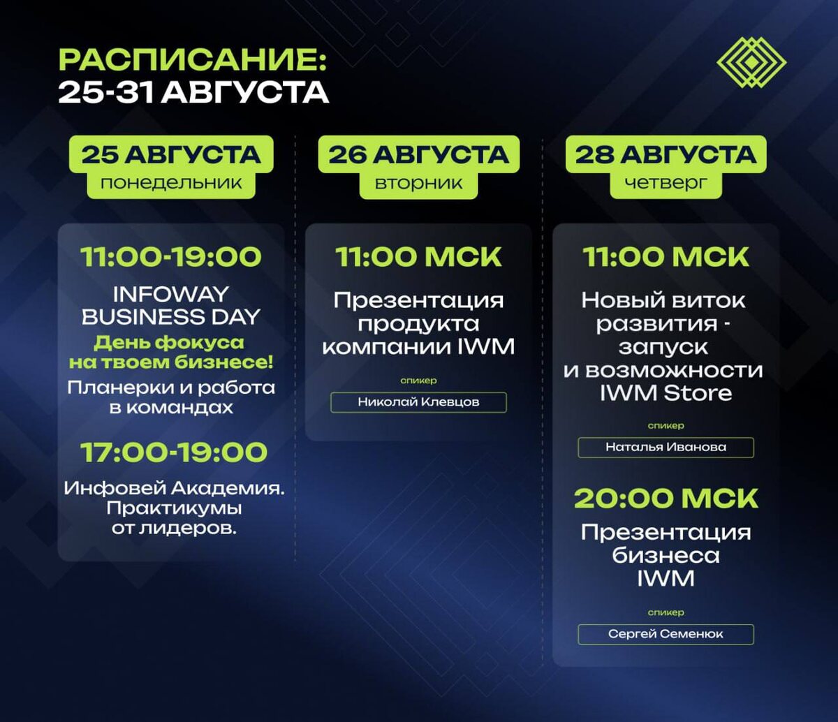 ✍️📈Сохраняем себе расписание на неделю 25-31 августа!