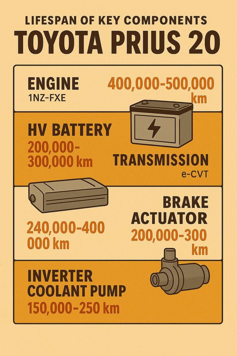 Надёжность Toyota Prius II (2003–2009): сильные и слабые стороны Введение Toyota Prius второго поколения (2003–2009), известный как Prius 20, стал массовым гибридом и настоящим хитом начала 2000-х. Машину покупали не только частники, но и таксопарки по всему миру. Именно опыт эксплуатации в тяжёлых режимах — лучший показатель её надёжности. Prius 20 доказал, что гибрид может быть долговечным и простым в обслуживании. ⸻ Сильные стороны • Ресурс ДВС: двигатель 1NZ-FXE, работающий по циклу Аткинсона, ходит до 400–500 тыс. км при регулярной замене масла. • Тормоза: благодаря рекуперации колодки и диски служат в разы дольше обычных. В такси передние меняли после 300 тыс. км, задние — после 500 тыс. км. • Трансмиссия e-CVT (планетарный редуктор): простая конструкция без сцеплений и ремней, в большинстве случаев живёт столько же, сколько автомобиль. • Электромоторы MG1/MG2: крайне надёжные, отказы случаются лишь на огромных пробегах (более 300–400 тыс. км). ⸻ Слабые места и типичные
