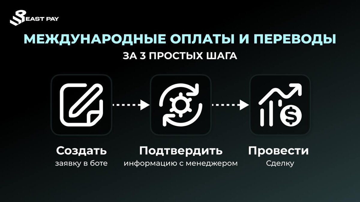 💸ВОЗМОЖНОСТИ EAST PAY О нас 🔘 Платёжный агент с офисами в 31 городе России 🔘Работаем с крупнейшими компаниями и обрабатываем сотни транзакций ежедневно 🔘 Команда профессионалов с многолетним опытом Как пользоваться ботом 1. Откройте @East_PaySer_bot в Telegram и нажмите «Старт» 2. Выберите направление перевода и валюту/тип выдачи 3. Укажите форму оплаты: • Наличные в наших офисах • Безналичный расчёт • Оплата от юридического лица 4. Подтвердите заявку и дождитесь сообщения от менеджера Персональная поддержка – Бесплатная консультация на каждом этапе – Наш менеджер ответит на любые вопросы и подскажет адрес ближайшего офиса Наши услуги 🔘SWIFT‑переводы 🔘SEPA‑переводы 🔘Оплата зарубежных счетов и инвойсов 🔘Выдача наличных за рубежом 🔘Обмен криптовалюты 🔘Пополнение AliPay и WeChat 🔘Возврат валютной выручки Мы осуществляем переводы и платежи в любую точку мира. Безопасность, прозрачность и скорость — наши главные принципы. 🔴🔴🔴🔴🔴🔴🔴🔴🔴🔴 🟠Получить консультацию: @east_