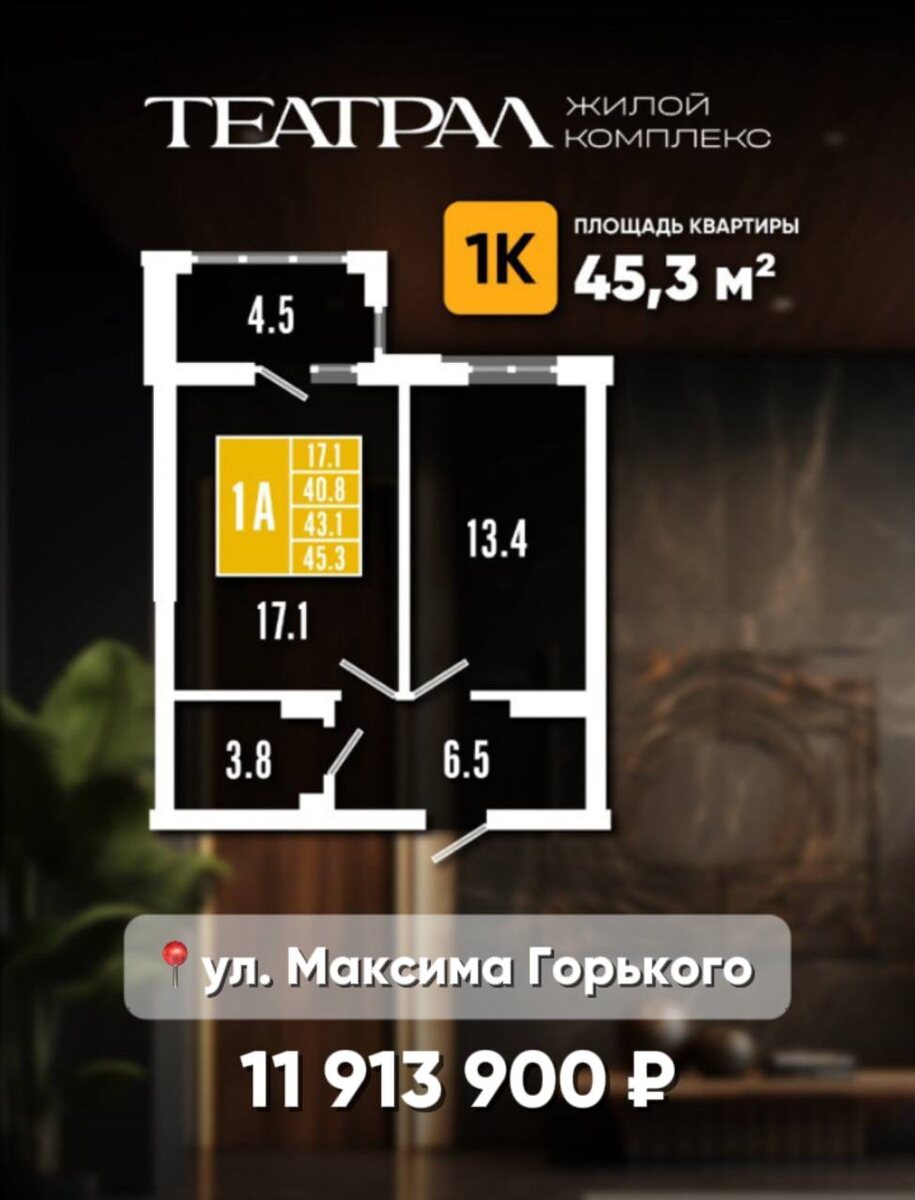 🏙️ ТВОЙ УМНЫЙ ФОРМАТ В «ТЕАТРАЛЕ» Планировка на 45,3 м², которая доказывает: роскошь — это не про метры, а про продуманность до миллиметра! ✨ Почему это идеальное решение: • Чёткое зонирование: кухня-гостиная совмещена эргономично, а спальная зона уединена. • Панорамные окна — свет и виды делают пространство воздушным. • Вместительный санузел с возможностью установки стильной мебели. 🎭 Для кого это? Для тех, кто ценит время, комфорт и статус. Здесь есть всё для жизни в ритме мегаполиса — без компромиссов. 💡 Цифры говорят сами: Площадь: 45,3 м² Цена: от 11,9 млн ₽ Локация: ул. Максима Горького — в шаге от культурной жизни города. Готовы ли вы переехать в квартиру, где каждая деталь работает на вас? Пишите — покажем её лично! 🔑
