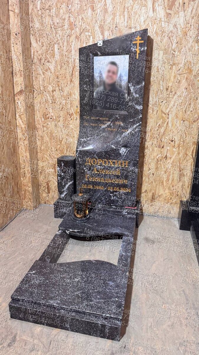 Выполненный из редкого гранатового амфиболита, он впечатляет насыщенным тёмным цветом с природными вкраплениями, будто внутри него застыла вечность. Камень невероятно прочен и сохраняет выразительность десятилетиями — не тускнеет, не выцветает, не поддаётся времени. Стела памятника — 140×55×20 см, общая высота с подставкой достигает 155 см. Скошенная линия в левую сторону создаёт ощущение движения и симметрии, символично разделяя прошлое и память о нём. Верхний строгий геометричный скос подчёркивает силу и завершённость образа. Для портрета используется керамогранит 30×40 см — долговечный и устойчивый к атмосферным воздействиям материал. Он сохраняет чёткость изображения десятилетиями и выглядит благородно, создавая ощущение личного присутствия. Золотые фрезерованные надписи подчёркивают значимость и индивидуальность. Современная технология обеспечивает долговечность и выразительность шрифта, кото