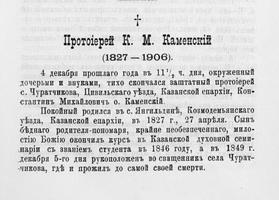 4 декабря прошлого года в 11 ½ часов дня, окруженный дочерьми и внуками, тихо скончался заштатный протоиерей села Чуратчикова Цивильского уезда Казанской епархии Константин Михайлович отец Каменский.