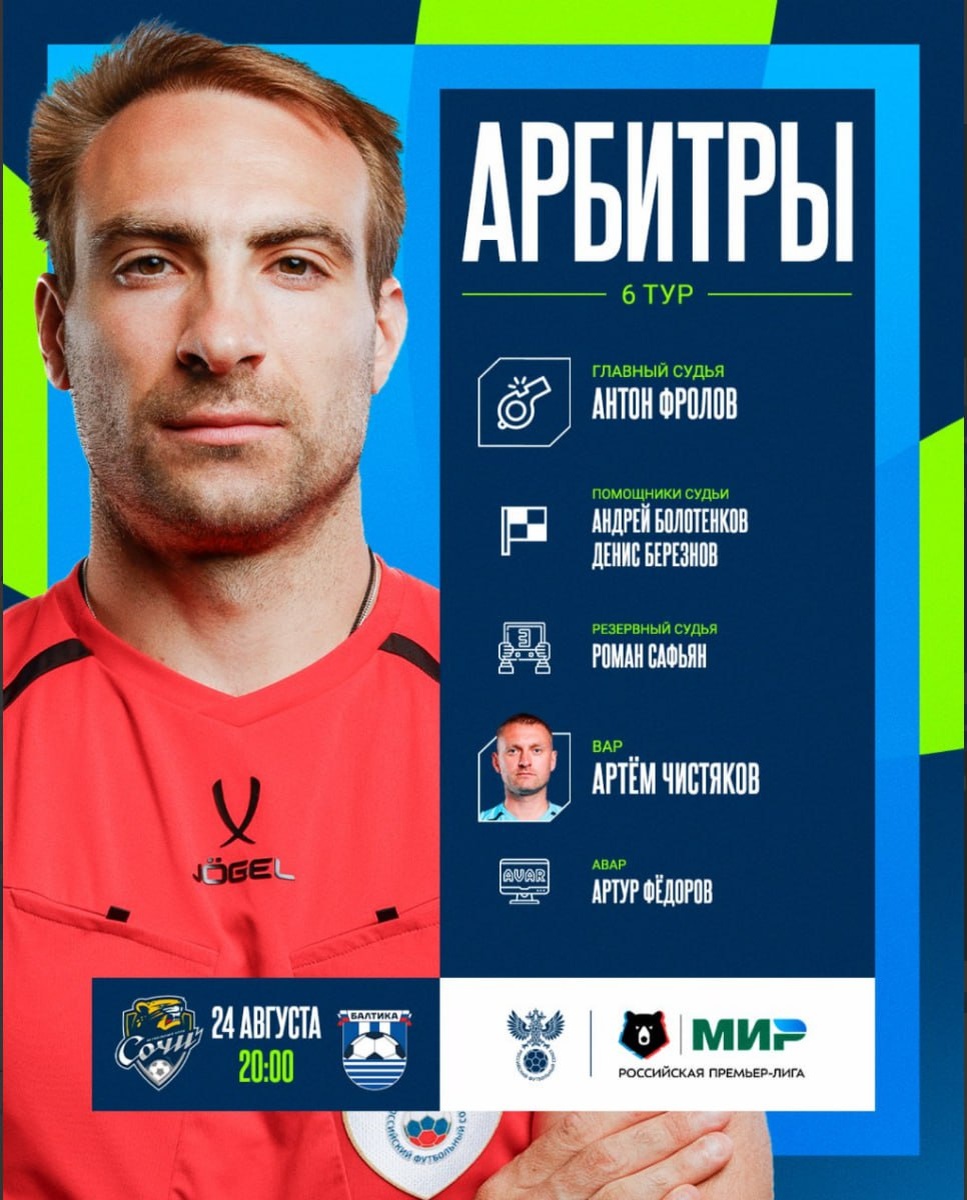 Сочи-Балтика 0-2 ❌ 1 мин. Не показ ж.к игроку №31 команды Балтика (грубая игра) - 0,1 балл ❌ 4 мин. Не показ ж.к игроку №2 команды Балтика (грубая игра) Ответственен резервный арбитр. ✅ 26 мин. Правильно назначил 11-м удар в ворота команды Сочи. ❌ 86 мин. Не показ ж.к игроку №5 команды Балтика (срыв перспективной атаки) - 0,1 балл Оценка: 8,2