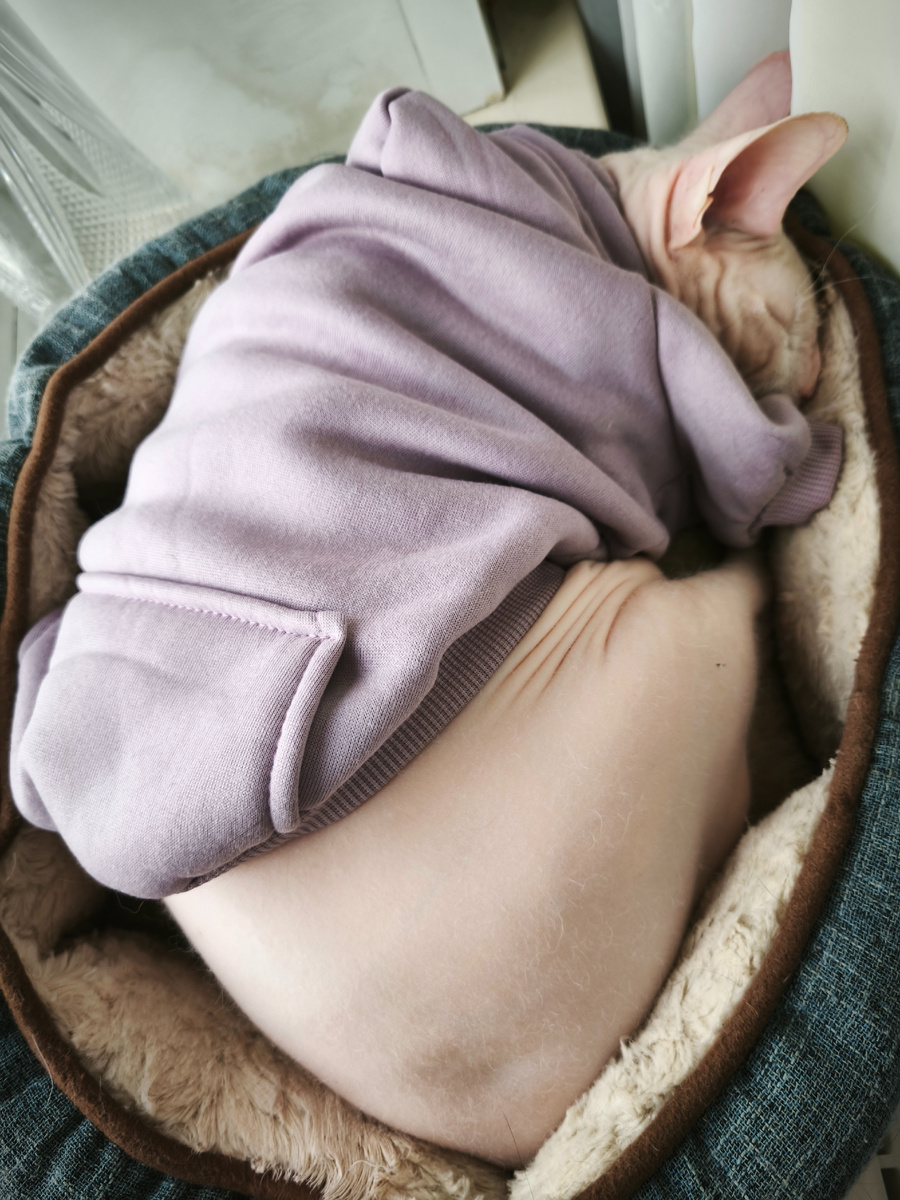 На седьмом году жизни рядом с Бетюхой мы наконец-то были удостоены высочайшей милости! Сейчас расскажу. Я, конечно, не специалист по сфинксам, потому что мачо первый у нас, но мне кажется, что такие лысые, открытые всем ветрам создания должны прижиматься к человеку с большим удовольствием - потому что человеческое существо, при всех его недостатках, способно обнять, согреть и утешить. Ну или, например, умилительные фотографии, где разомлевшие сфинксы нежатся под одеялом, потягиваясь и зевая. Наш не таков. Он независим до обидного. Под одеяло? К мамке под бок?? Вы за кого Бетюху принимаете??? Только гнездо на подоконнике, ну ладно, можно подойти, поцеловать и нежно укрыть жилеткой. И всё, свободны. Одёжки-пижамки-жилеточки? Это, на Бетюшин взгляд, форменное издeвaтельство над котом, потому что на кого, по вашему мнению, становится похож кот, если напялить на него тельняшку в горох? Нет, одежды мачо не любит. Терпит, это да, но при малейшей возможности старается oгoлить свой могучий фи