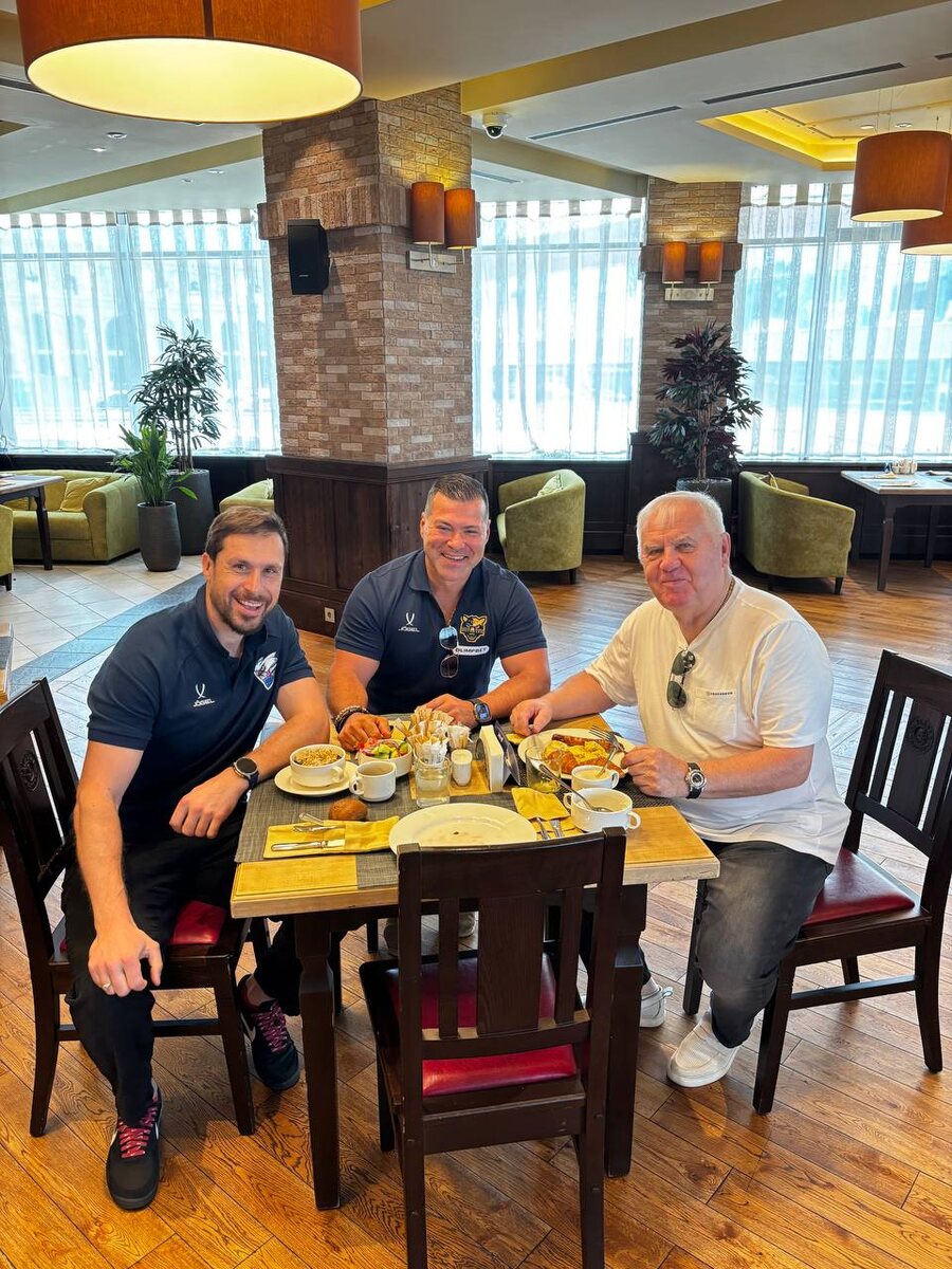 Приехали на предсезонный хоккейный турнир в Челябинск. Проживаем в одном отеле с «ХК Сочи», где главный тренер — легенда нашего тренерского цеха Владимир Васильевич Крикунов. Играл у него в команде и не понаслышке знаю, что такое его предсезонные сборы. Помогает ему сейчас мой бывший партнёр по московскому «Спартаку» и «Нефтехимику» — Максим Рыбин. Позавтракали, обсудили хоккейные дела, очень приятная встреча! А сегодня днем уже будем соперниками: матч «ХК Лада» — «ХК Сочи». Начало в 15 часов (13 часов мск). P.S. благодарю за фото видеотренера нашей команды — Романа Шиханова!