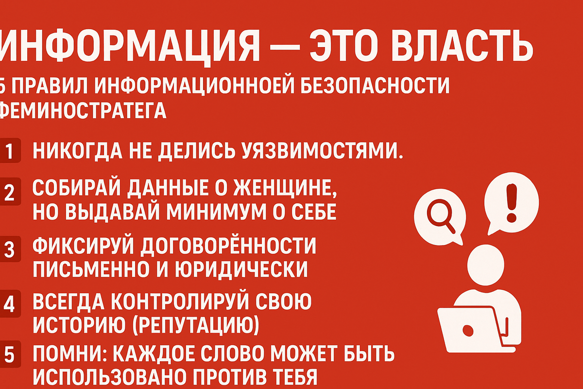🦉 Информация — это власть (феминостратегический разбор) Матриархат построен не только на законах и ресурсах, но и на информации: 👉 Контроль над информацией = контроль над поведением мужчин. Женщина часто это не только «эмоции», но и информационный агент матриархата. Женщина не всегда сильнее физически, но информационно она вооружена лучше, чем неподготовленный мужчина. Феминостратег понимает: Матриархат держится на информационных манипуляциях: через эмоции, законы, социальные установки. Феминостратег сохраняет власть только тогда, когда: 👉 Информация — это власть. А власть над твоей жизнью обязана принадлежать только тебе.