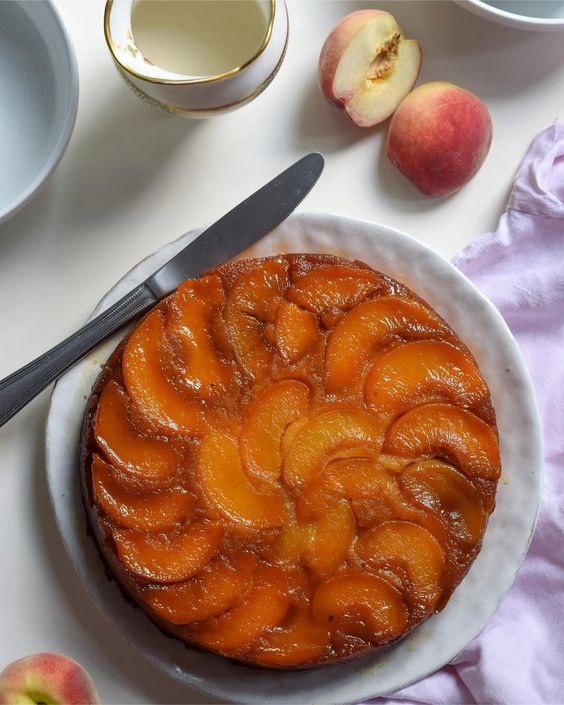 Персиковый пирог “Тарт Татен” — от него веет теплом, уютом и и нежной карамелью. Персик можно заменить яблоком, сливой, абрикосом, бананом. Невероятное наслаждение гарантировано! 🌿 Ингредиенты: 🔸 Персики — 500 г 🔸 Лимонный сок — 2 ст. л. 🔸 Корица — 1 ст. л. 🔸 Тёртые яблоки (или повидло) — 150 мл + 100 мл воды 🔸 Сахар — 100 г 🔸 Масло растительное — 6 ст. л. 🔸 Разрыхлитель — 2 ч. л. 🔸 Соль — щепотка 🔸 Мука — 260 г Для сиропа: 🔸 Масло — 2 ст. л. 🔸 Сахар — 6 ст. л. 🌸 Приготовление: 1️⃣ Персики нарезать дольками 2️⃣ Приготовить сироп из 2 ст. л. масла и 6 ст. л. сахара 3️⃣ Выложить персики красиво на дно формы — одним слоем и залить приготовленным сиропом 4️⃣ Приготовим тесто: тёртые яблоки залить водой, пробить блендером. Добавить сахар, масло, соль, разрыхлитель, перемешать. Всыпать муку — тесто должно быть густым, как на ложке держится. 5️⃣ Выложить тесто сверху на персики. 6️⃣ Выпекать при 190°C 35–40 минут. 🌿 Перевернуть пирог тёплым, чтобы карамель красиво стекла