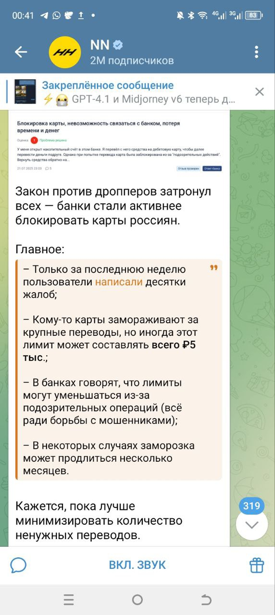Карты россиян блокируют все чаще ичаще. Операции блокируют все чаще. Не дают нормально переводить и получать деньги. Тот же Сбер может не просто отклонить нужный вам перевод на 24 часа потому что их искусственный интеллект настроен косо-криво, а вовсе заблокировать вашу карту с необходимостью посещения офиса... Канал NN предлагает минимизировать количество переводов, а я считаю, что нужно менять банк. Скажите, если вас, как самозанятого, который платит налоги, банк ВТБ или Сбер блокирует или пишет вашим клиентам о возможном мошенничестве ввиду чего вы теряете доход, то зачем обслуживаться в таком банке? Действительно смешно выглядит реклама того же ВТБ, который привлекает самозанятых. Зачем??? Чтобы потом их блокировать по 115 ФЗ? :). Или зарегились Вы в Сбере, люди пытаются отправить Вам деньги, а не могут потому что есть риск мошенничества... Мне столько раз приходилось то перекидывать деньги через другие банки, а то и вовсе отвозить людям наличку. Идиотская же ситуация когда твой
