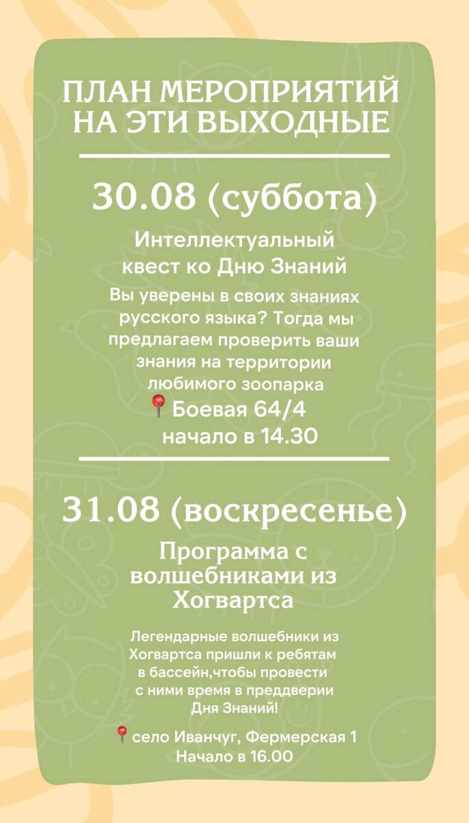 🐘🌿 План мероприятий на выходные в зоопарке «Баба Фрося»! 🌿🐒 Суббота, 30.08: Интеллектуальный квест ко Дню Знаний 🧠 Вы уверены в своих знаниях русского языка? Наизусть знаете все теоремы по геометрии и формулы по алгебре? Тогда мы предлагаем проверить ваши знания на территории любимого зоопарка. Если вы пройдёте все интеллектуальные испытания – получите призы от партнёров! 🎁 📍Боевая 64/4 🕒Начало 14.30 Воскресенье, 31.08: Программа с волшебниками из Хогвартса 🧙 Легендарные волшебники из Хогвартса пришли к ребятам в бассейн, чтобы провести с ними время в преддверии Дня Знаний! 📍с. Иванчуг, Фермерская 1 🕓 Начало 16:00 📅 Ждем вас всей семьей! 📍 Где: зоопарк «Баба Фрося» 🔖 Мероприятия входят в стоимость билета
