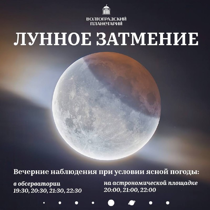 ................................................ ПОЛНОЕ ЛУННОЕ ЗАТМЕНИЕ #астрономическиесобытия ................................................ ⠀ ⠀ 7 сентября состоится полное лунное затмение — первое за последние 7 лет, видимое на европейской части России. Следующее полное затмение Луны, видимое в Волгограде, будет 31 декабря 2028 года. 🔘 Луна начнёт входить в земную тень в 19:27. 🔘 Максимальное погружение в тень произойдёт в 21:12, при этом вся Луна окрасится в тёмно-коричнево-красный цвет. 🔘 Выход Луны из тени начнётся в 21:53, и к 22:56 завершится полностью. ⠀ По цвету и глубине затмения можно будет оценить состояние атмосферы нашей планеты, а также с интересом наблюдать слабое свечение некоторых лунных кратеров. ⠀ 🔴🔴🔴🔴🔴🔴 ⠀ ‼️ В Волгоградском планетарии, при условии ясной погоды, наблюдения будут проходить в двух локациях: ⠀ ⠀ 🔭 Астрономическая площадка (каждая группа до 20 участников): ✔️ Группа №1: с 20:00 до 20:50 ✔️ Группа №2: с 21:00 до 21:50 ✔️ Группа №3: с 22:00