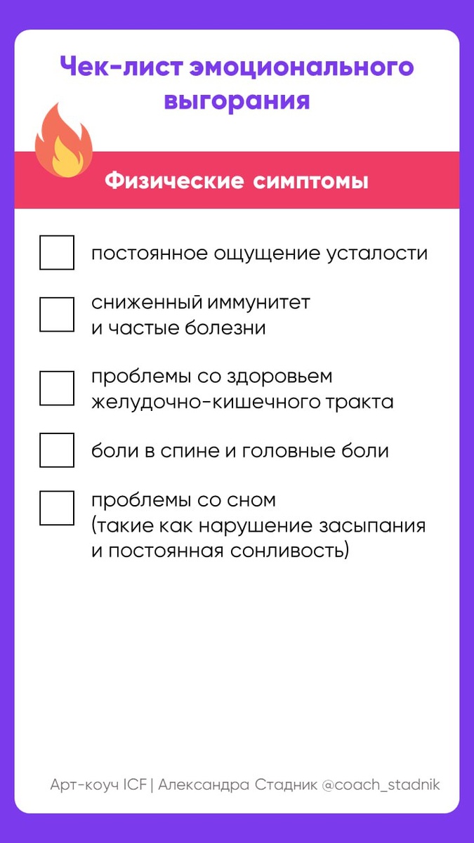 Пора ли взять паузу или насколько я уже выгорел? В субботу затронула тему восстановления ресурсов и необходимости пауз, но судя по молчанию в комментариях, то паузы даже просто на то, чтобы об этом подумать и поделиться мыслями в жизни найти достаточно сложно (понимаю, принимаю 🩵). Спасибо Инне, которая в момент написания поста, развеяла тоску в комментариях) Предлагаю в свободную минутку пробежаться по чек-листу и проверить сигналы своего организма. 🔥 — поймали себя на том, что начали выгорать ❤️ — у вас всё ОК в этом плане Маякните в комментариях, сколько галочек у вас получилось) 😌@coach_stadnik #ресурс #выгорание