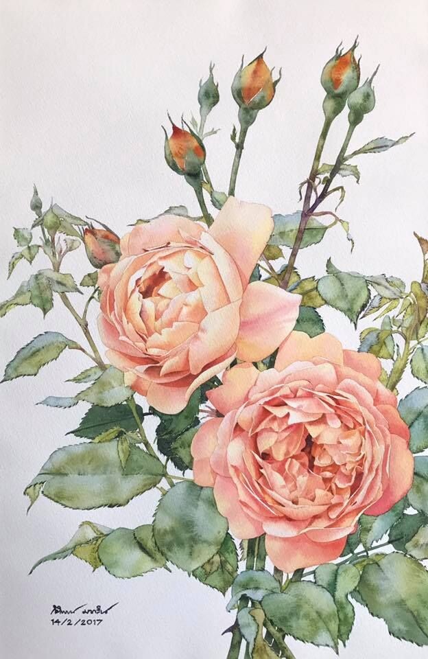 Рисовать розы акварелью – это всегда вызов. Сложная архитектура лепестков, тонкие градации цвета, важность передачи лёгкости, прозрачности, создание глубины и объёма – всё это манит художников и мастер из Таиланда Kitipong Maksin не остался в стороне.