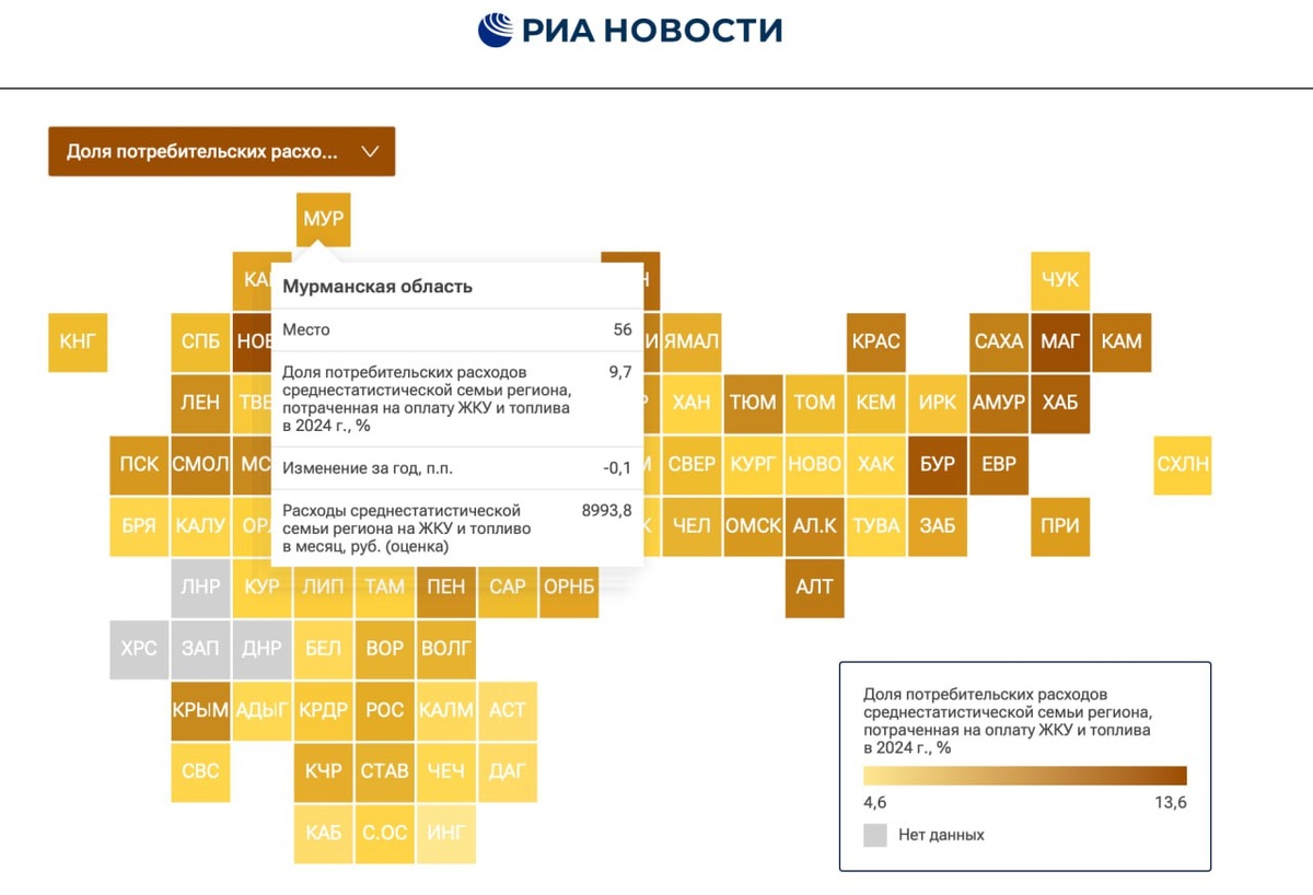 Мурманская область оказалась в середине рейтинга российских регионов по расходам на услуги ЖКХ, который составляет РИА Новости