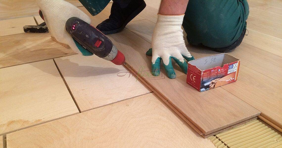 Считается самым прочным методом. Он применяется при укладке на фанерное основание. Планки не только приклеиваются, но и дополнительно фиксируются саморезами. Саморезы вкручиваются под углом 35–45 градусов в «шип» или «паз» доски с шагом около 40 см. Этот метод обеспечивает максимальную надежность крепления.