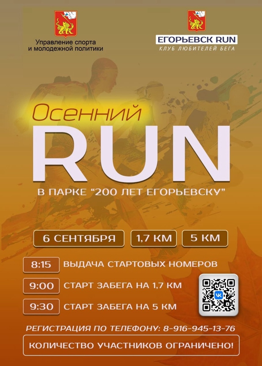 Управление спорта и молодежной политики администрации м.о. Егорьевск и клуб любителей бега приглашают желающих принять участие в первом осеннем беговом мероприятии - легкоатлетическом парковом забеге «Осенний Run». Забег состоится 6 сентября в парке "200 лет Егорьевску". Гостей ждёт 2 дистанции: 1,7 км для детей до 14 лет, а также 5 км для детей и взрослых старше 15 лет. Регистрация начнется в 8:15 у фонтана в парке. При себе нужно иметь документ, удостоверяющий личность, и медицинскую справку о допуске к соревнованиям. Старт первого забега назначен на 9:00. Записаться можно по номеру телефона: 8-(916)-945-13-76. 0+ Количество участников ограничено #подмосковье #НашеПодмосковье #муниципальныйокругЕгорьевск #моЕгорьевск #егорьевскоетелевидение #егорьевскоетв #Егорьевск #администрацияегорьевск