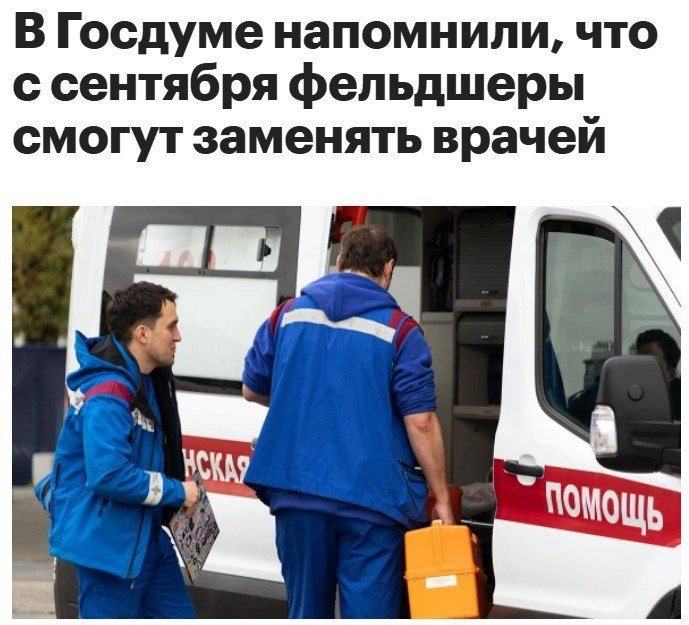 🇷🇺 Средний медперсонал вместо врачей С 1 сентября россиян начнут лечить фельдшеры и акушерки без высшего образования из-за нехватки врачей. 🧑⚕️ Им разрешат заменять терапевтов, педиатров и гинекологов: проводить осмотры, собирать анамнез, назначать лекарства и обследования. По данным Минздрава, стране не хватает более 23 тысяч врачей и 63 тысяч медсестёр и фельдшеров. 🩺 °Telegram • Zen • Bastyon° ✒️Предложить новость