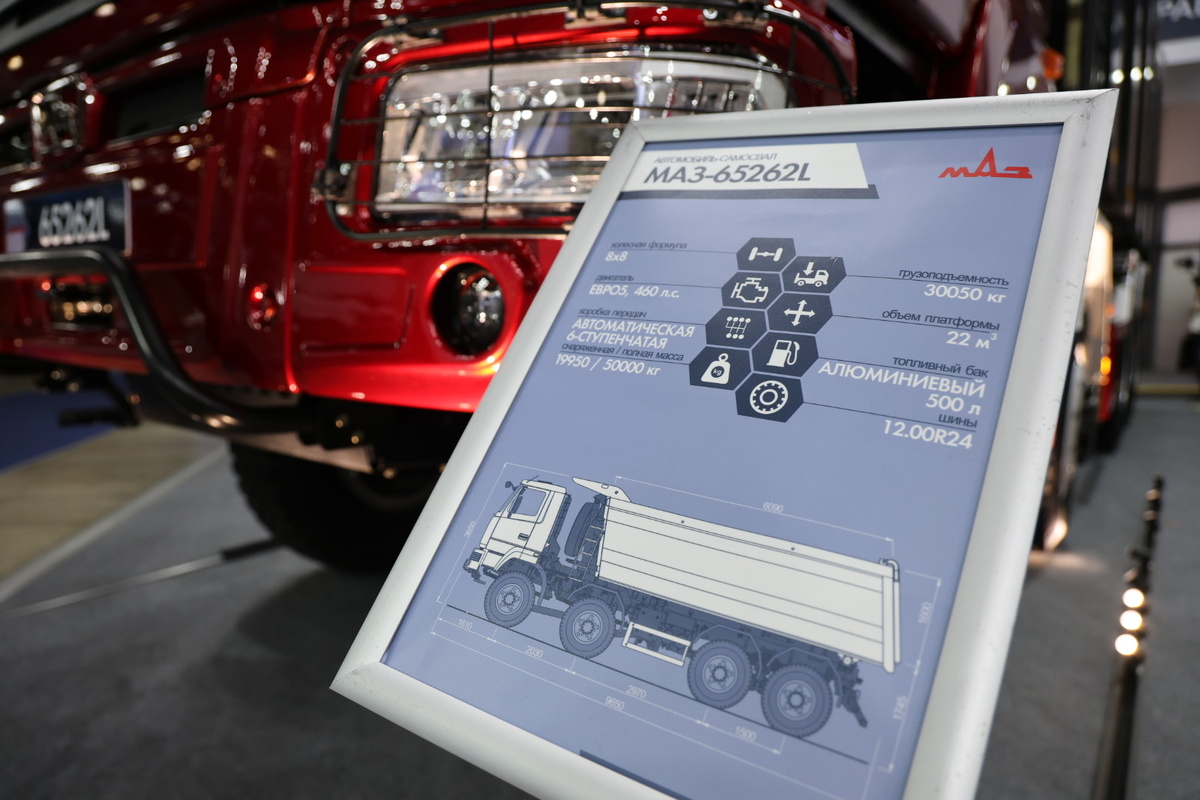 Высоколокализованная машина. Мы сами это всё делаем. Это каркас, облицовка, агрегатная база, мосты гипоидные. Это всё наше. Электроника белорусская. Многое из оснащения белорусское, поэтому развиваемся. А грузовые автомобили? В этом году представляем линейку 6х2. Это тягач трёхосный с задней подъёмной осью, роботизированная коробка передач. Шасси тоже трёхосное и оснащено изотермическим фургоном. Хотелось бы отметить, что сделано по техническим требованиям компании RULOG, которая является логистической компанией. Они сегодня как раз-таки приезжали и смотрели этот автомобиль. И самосвал 8х8, наш самый мощный, 50-тонный, с автоматической коробкой передач. Я хотела бы сказать, что вся техника, которая здесь представлена, здесь нет механики. Туристический автобус – автомат, 8х8 – автомат, тягач и шасси – роботизированная коробка.
