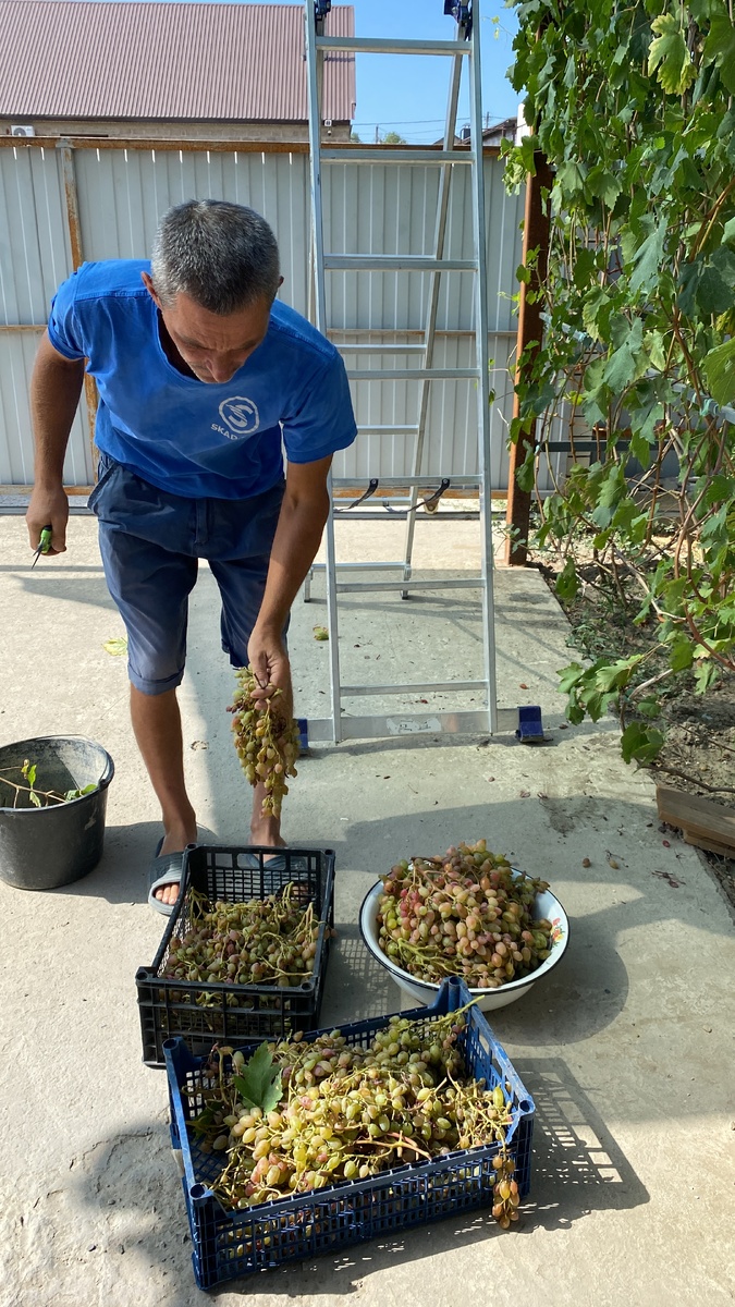 Солнечная ягода и напиток Богов. Правда ли? Друзья приветствую Вас на своём канале . Немного слов и букв, рубрика мои мысли «прибежали и убежали». Вот и август, бархатный сезон, тёплые дни и холодные ночи… Осень тихой поступью подходит в своё властвование. Для меня осень - это новый период жизни, перезагрузка и загрузка в тоже время))) Удивительная пора наступает на виноградниках. Многие сорта созрели. Осы атакуют, хотят насытиться солнечной ягодой. И начинается уборка винограда. Вот и первый наш южный урожай. Пусть не такой большой, но всё же он есть. Это сорт Преображение. Для меня он оказался капризным. Или я просто ещё учусь и не совсем ещё освоила все прелести виноградных дел. Спасибо что есть друзья, которые с радостью помогут. Но и нужно прочувствовать всё самой, набить руку, и шишку))) что бы реагировать быстрее с болезнями винограда. Вот столько получилось у нас винограда. А это сорт киш миш Лучистый, дочка его обожает. Пусть висит и спеет дальше. А я решила перемять виноград