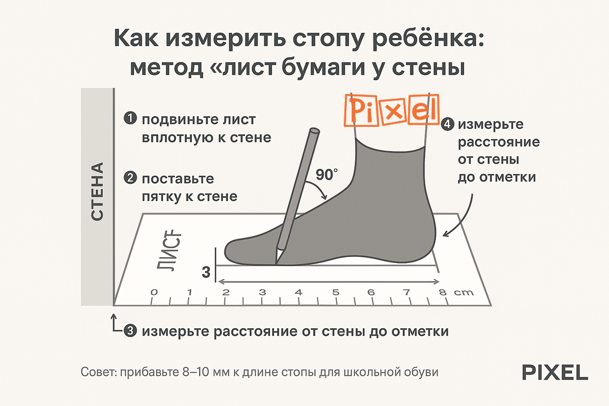 Самый частый вопрос после того, как удалось точно измерить стопу: сколько прибавлять? Базовое правило для школьной повседневной обуви — прибавка 8–10 мм к «чистой» длине стопы. Это не «на вырост», а функциональный запас под биомеханику шага и условия носки: