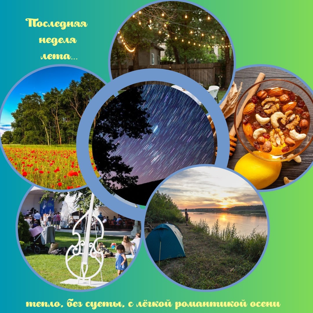 🔥Последняя неделя лета... Не начинать? Грустно, но можно настроиться по-другому: есть несколько дней, чтобы сделать то, что не успели за эти месяцы. Закрываем лето — тепло, без суеты, с лёгкой романтикой осени. 🌺Вода Ночь в палатке у воды или дачный «ретрит»: ужин на углях, звёзды, утренний туман, обратный путь после обеда. Рыбалка на закате с мостика/лодки, потом чай у воды. Даже если не клюёт — мозг «перезагружается». Баня + холодная купель под открытым небом. Контраст как «кнопка ресет». Для закалённых: последнее тёплое купание на ближайшем озере/реке + термос и плед на берегу. Вечерние туманы сейчас — подарок для нервной системы ⭐Небо Ночное небо без подсветки: выезжаем в тёмную точку (поле/берег), лежим на коврике, считаем спутники, смотрим Млечный Путь. Тихая «звёздная сессия» на 40–60 минут. И приложение StarWalk. Фотопрогулка «туман/роса/паутинки» на рассвете. Конец августа — пик красивых утренних кадров. 🌺Лес и поля Побыть грибниками, собирать и ягоды - то, что осталось: ч