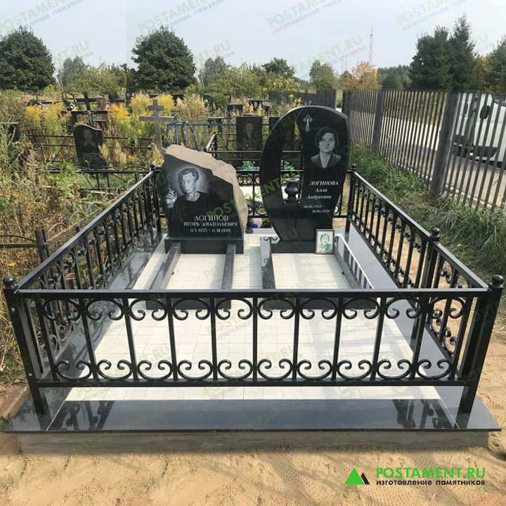 На кладбище Щёлково установлен мемориальный комплекс, созданный из гранита «Цветок Урала», габбро-диабаза и металла – как скорбная симфония в камне и ковке. Памятники, словно из самой тьмы, высечены из чёрного габбро-диабаза. Мужской — монументальная «скала» лишь с одной полированной гранью, воплощает собой несокрушимость и величие, напоминая о суровой мощи природы. Женский памятник, напротив, — воплощение изящества и нежности. Пятисторонняя полировка подчеркивает плавность линий, а вырез в форме пламени свечи, трепетно мерцающий в камне, символизирует неугасающую память. Лики ушедших, запечатлённые лазерной гравировкой пятого поколения, смотрят с портретов, полных тепла и жизни. Металлическая ограда, кованым кружевом оплетающая гранитный парапет, словно оберегает тишину этого скорбного места. Традиционный узор — ритм прямоугольных стоек и завитков, не соприкасающихся между собой, создает ощущение лёгкости и воздушности. Заглублённые в землю стойки, надёжно закреплённые на гранитном и