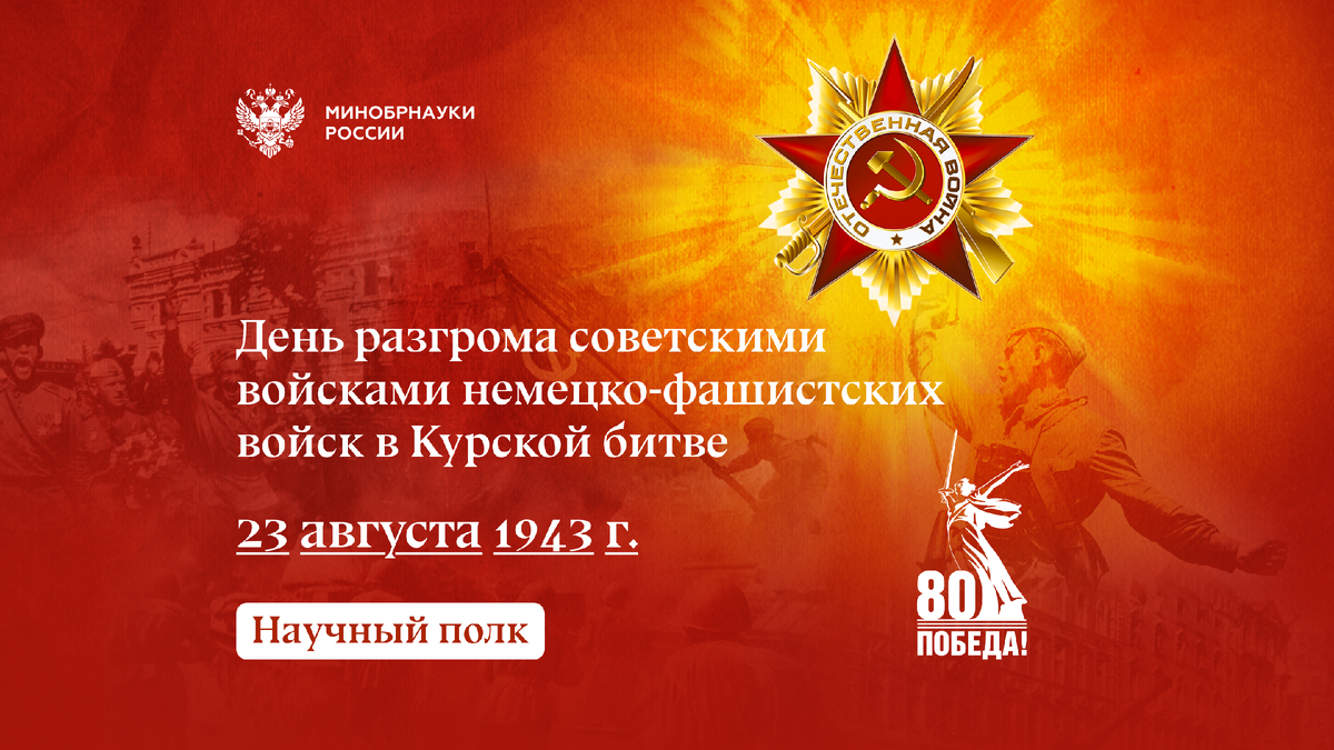 23 августа в нашей стране отметили День воинской славы России — день разгрома советскими войсками немецко-фашистских войск в Курской битве (1943 год) Какие материалы подготовили университеты и научные организации к годовщине этого великого события, — в дайджесте «Научного полка». ННГАСУ чествуют своего студента сантирано-технического факультета ГИСИ Евгения Аплеталина. НГУАДИ рассказали об участнике тех событий — Егоре Белове. Иркутский политех поделился фактами о Борисе Кондуренко — участнике Курской битвы. Приазовский государственный технический университет опубликовал пост про значение Дня воинской славы в истории России. Среди участников крупнейшего танкового сражения – преподаватель Брянского государственного университета, кандидат философских наук, доцент Владимир Мартышеня. В КЧГУ вспоминают Героя Советского Союза, преподавателя гражданской обороны Харуна Богатырева, который принимал участие в Курской битве и лично подбил 6 тяжелых танков. СПбГЛТУ опубликовал материалы, подробн