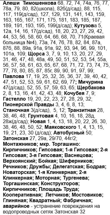 🚱Кировский район частично остается без холодной воды На сайте 005 сказано, что вода отсутствует на 17 улицах города и в мкрн. Торгашино. В «КрасКоме» сообщили, что авария произошла на ул. Затонской, 32/2, на магистральном водопроводе. Ориентировочно, воду вернут после 15:00, но оно может измениться. Специалисты проводят работы по восстановлению водоснабжения. _____ 🔴Оставить обращение ✏️ 🔴Подписывайтесь на 8 канал