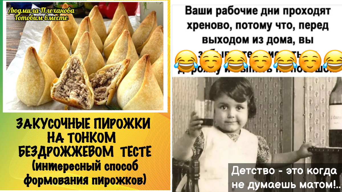 Ездил к родственникам в Германию — сестра моей жены замужем за немцем (коренным, настоящим). По приезду заполучил себе (извиняюсь) расстройство желудка. Таблетки, предложенные хозяевами, дали нулевой результат. Посему пришлось прибегнуть к народному средству — водка с солью. Через некоторое время простыл (виноват кондиционер в машине). Снова "народная медицина" — водка с перцем. Еще через некоторое время начало ныть колено, прооперированное несколько лет назад. Приходит муж сестры, держит в руках бутылку водки и спрашивает: "Что на этот раз добавлять будем? " /весёлая история из жизни/ Сегодня у меня для вас самый быстрый рецепт слоёных пирожков на тонком бездрожжевом тесте. Из этого теста можно делать пирожки с любой начинкой: и сладкой, и несладкой. Сегодня у нас будут пирожки с несладкой начинкой. Тесто в этих пирожках получается слоеное, но нежное и хрупкое. И делать его очень и очень быстро 🔥Конечно же, в конце статьи ⤵️⤵️⤵️ будет и «минутка юмора», которая сделает эту статью
