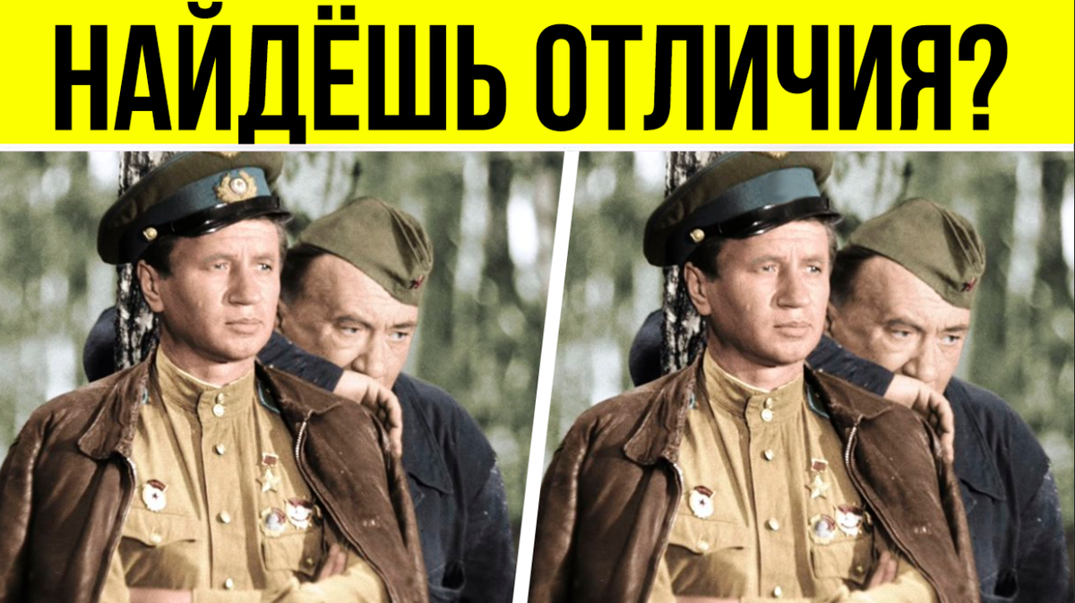 Всем привет! Вы на канале "Сравним"! Что ж, первый блин вышел комом, судя по комментариям🙂 Я попытался провести работу над ошибками, и сделать так, чтобы вы не путались там, где этого не предполагалось🙂 Этот тест будет не самым длинным, так скажем, очередной пробой пера. И если эта версия вам понравится, будем продолжать. Ну а нет...по крайней мере я попытался. Я подготовил вам 3 ребуса с отличиями в кадрах из советского кино, а также немного интересных фактов про эти фильмы. Делитесь своими результатами в комментариях: сколько отличий нашли, на каком фильме «споткнулись» и какой момент из этих картин до сих пор любимый. Приятного прохождения! Перед нами фильм, который умеет делать невозможное: показывать войну так честно и горько, что ком в горле — и при этом дарить светлое послевкусие. Леонид Быков придумал свою «поющую эскадрилью» не ради красивого хода: песня здесь — не украшение, а способ держаться за жизнь, когда завтра может не наступить. Капитан Титаренко по прозвищу Маэстр