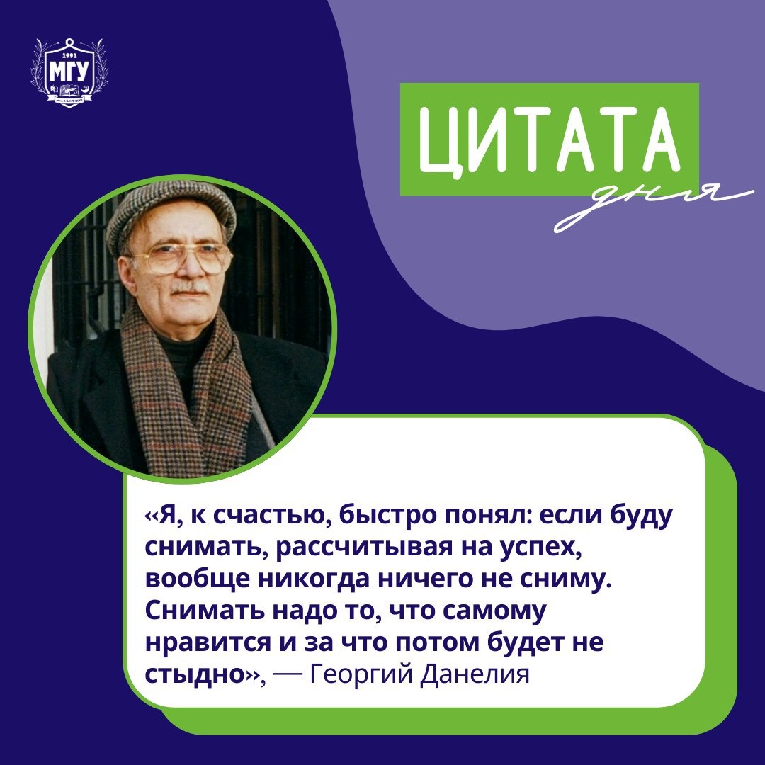 #цитата_дня Он замечал в повседневной жизни как смешное, так и грустное, и превращал это в сцены, понятные и близкие каждому. 🩵 🩵 25 августа 1930 года родился Георгий Николаевич Данелия — советский и российский режиссёр, сценарист и актёр, Народный артист СССР. 🩵 🩵 🩵 Фильмы Данелии стали частью культурной памяти: «Я шагаю по Москве», «Мимино», «Осенний марафон», «Кин-дза-дза!». Герои его картин были понятны каждому — немного растерянные, наивные, упрямые, но всегда искренние.🩵 🩵Интересный факт: когда снимали «Я шагаю по Москве», чиновники были озадачены — где юмор? Данелия невозмутимо объяснил, что это лирическая комедия, и предложил так и написать в титрах. С тех пор жанр «лирическая комедия» стал официальным. #МГУимениКуинджи