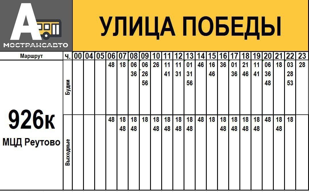 🚌В Реутове улучшили транспортное сообщение на маршруте № 926к С 25 августа 2025 года в Реутове вступает в силу новое расписание автобусного маршрута № 926к. Обновление предусматривает увеличение количества рейсов в будние дни с 58 до 66 и добавление одного автобуса малого класса. Это решение принято в рамках планомерной работы по повышению качества транспортного обслуживания горожан. Администрация города Реутов совместно с профильными структурами Московской области ведёт системную работу по модернизации и развитию транспортной инфраструктуры. Основная цель — сделать городской общественный транспорт более доступным, комфортным и соответствующим реальным потребностям пассажиров. Добавление дополнительных рейсов на маршруте № 926к позволит сократить интервалы движения, повысить вместимость и снизить нагрузку в часы пик, что особенно актуально в начале учебного и делового сезонов. Актуальное расписание размещено на всех остановочных пунктах, расположенных по маршруту следования, чтобы