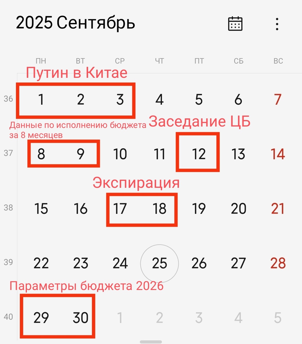 $€ Впереди нас ждёт очень насыщенный сентябрь. Будет много важных событий, которые способны сильно двинуть фондовый рынок в целом, и отдельные активы, в частности. Поэтому решил рассказать вам о них заранее. Чтобы читатели моего канала были осведомлены и подготовлены. ☑️Начало месяца - визит президента РФ в Китай. Будет много заявлений. Возможно будут озвучены какие-то договорённости. И в сфере политики, и на корпоративном уровне. ☑️Чуть позднее, 7-8 сентября получим данные по дефициту бюджета с января по август. Будет видно, увеличивается ли дефицит бюджета и дальше, или ситуация стабилизировалась. ☑️Далее 12 сентября заседание ЦБ по ключевой ставке и пресс-конференция. Думаю важность этого события всем понятна. ➡️В середине месяца, 17-18 сентября смена контрактов и квартальная экспирация по всему миру. Будет очень высокая волатильность. ➡️В конце месяца мы получим данные по параметрам бюджета на 2026 год. Это очень важная информация, которая влияет на инфляцию, действия ЦБ и