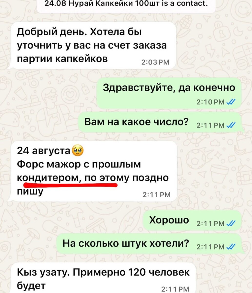 Поделюсь своей историей про сорвавшийся заказ. Несколько дней назад у меня заказали 100 капкейков на Кыз Узату. Готовность на сегодня. Я все приготовил, упаковал, отправил фото и заказчице и адрес. И тут она пишет: "Вы что, из Алматы? Я думала, что вы в Астане." Хотя у меня во всех социальных сетях на страницах указано, что я работаю в Алматы. Этот момент мы сразу не уточнили, это моя вина тоже. Я ее прекрасно понимаю, какого это, готовиться к такому большому событию. Оказалось, что до этого их уже подвел кондитер. Получился форс-мажор, искала срочно, поэтому и допустила ошибку. В итоге у меня остались 100 свежих капкейков без хозяев. Я сразу написал в чат ЖК, рассказал о ситуации и предложил их со скидкой, чтобы хотя бы часть денег вернуть заказчице. Параллельно начал писать знакомым кондитерам в Астане-вдруг кто-то сможет принять заказ и приготовить хотя бы часть. Сейчас капкейки у меня в Алматы. Одна из подписчиц высказала мнение, что инфор