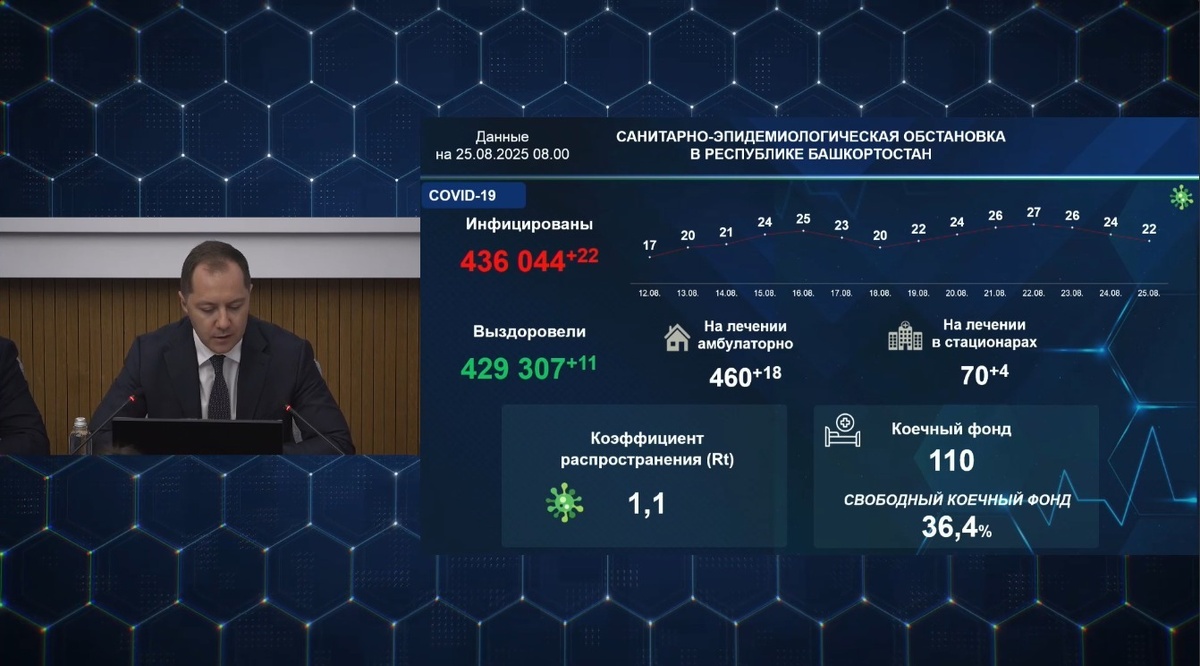 Сегодня на стационарном лечении находятся 70 пациентов, свободный коечный фонд составляет порядка 36,4%. Об этом сообщил министр здравоохранения республики Айрат Рахматуллин на оперативном совещании правительства в ЦУРе.