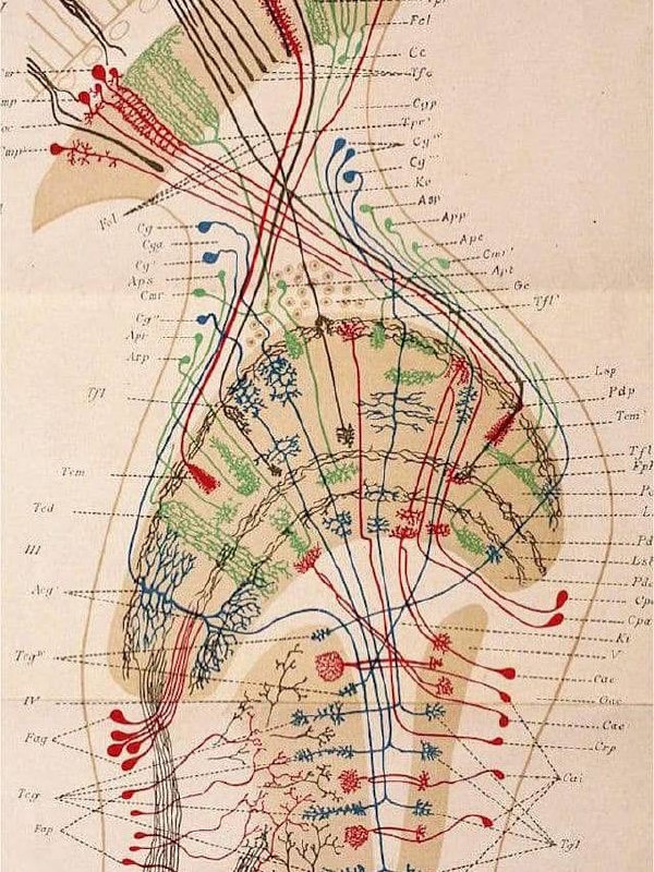 Сантьяго Рамон-и-Кахаль, иллюстрация из книги "Вклад в изучение нервных центров насекомых", 1915 год На схеме представлена сложная анатомия нейронов в сетчатке и зрительной доле медоносной пчелы
