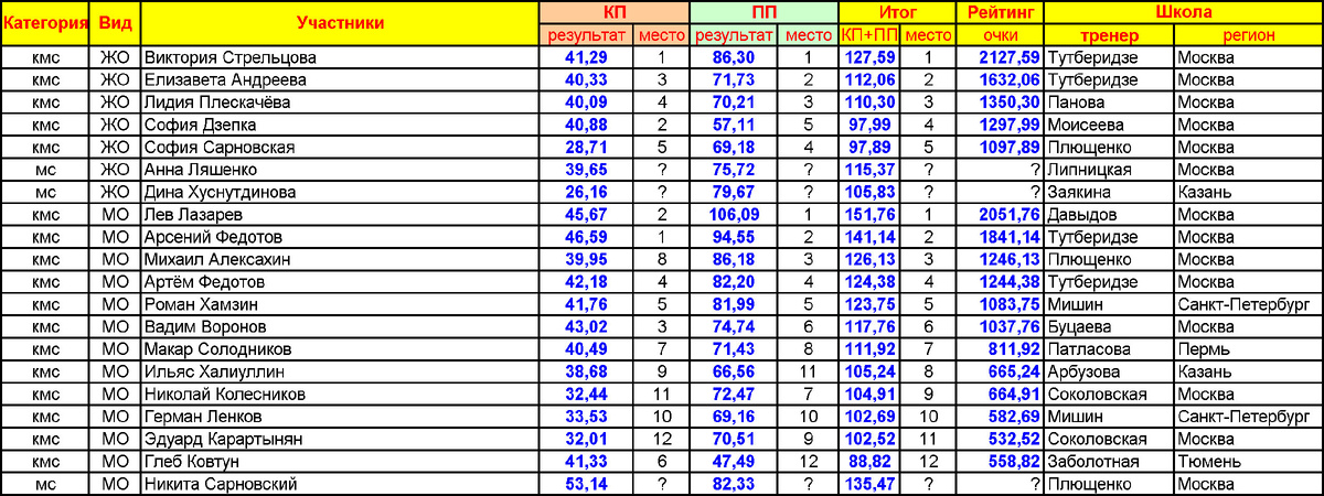 Прошли первые прокаты с участием представителей ТШТ. Юниоры приняли участие в контрольных прокатах сборников страны. Официальных результатов нет, но с помощью автора канала Макса Ягудина можно ранжировать выступления одиночников. Без учёта оценок за компоненты. Парники остались без оценок и в рейтинге учитываться не будут. 11-13 августа. Химки. Контрольные прокаты юниоров-одиночников. Ляшенко, Хуснутдинова и Сарновский катали взрослые программы и их результаты будут учтены позднее после контрольных прокатов старших сборников. 20-21 августа. Химки. Контрольные прокаты юниоров-парников. Так же прошли первые турниры с участием фигуристов из России. Предлагаю вашему вниманию информацию по ним. 17 августа. Гродно (Белоруссия). Кубок Единства. 21-24 август. Минск (Белоруссия). Кубок Беларуси (1 этап). В составе ТШТ изменения. Убыли тренер Ольга Волобуева и одиночница София Шарипова. Прибыла после контрольных прокатов на просмотр одиночница Дина Хуснутдинова. Если кто-то обнаружи